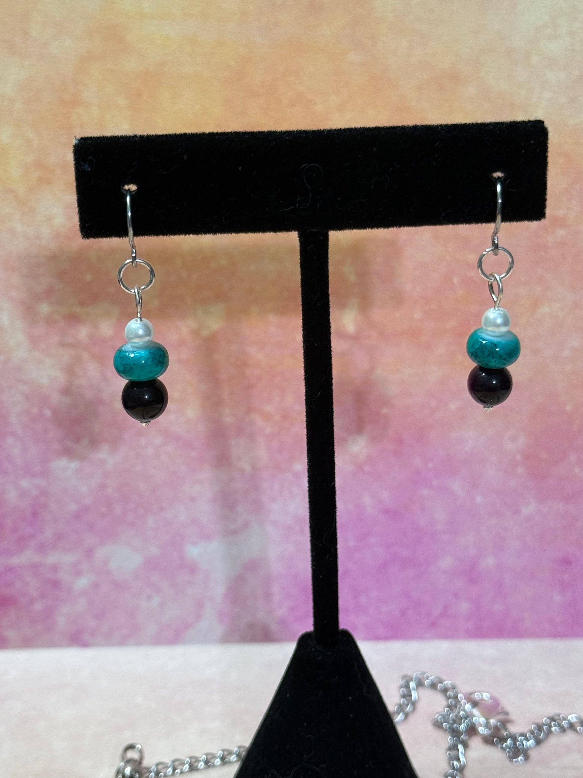 This necklace, bracelet and earrings set is made up of purple Tiger Eye rounds, green with yellow glass rondelles, white glass pearls, and Tiger Eye star cut rounds. The silver beads with silver bead caps add a fun texture and color to the focal point of this necklace.