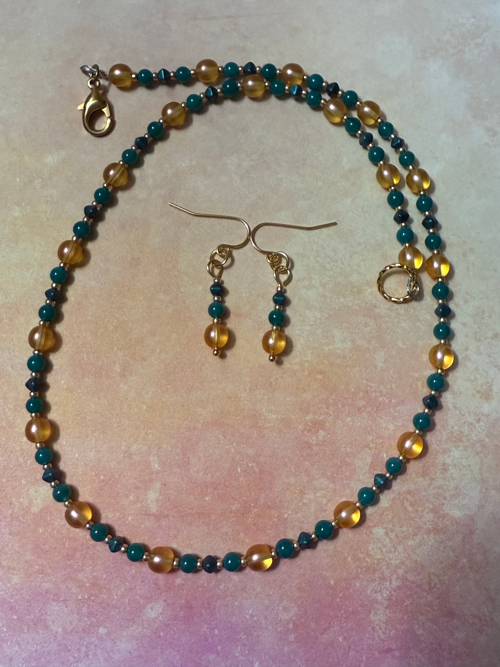 This dainty beaded necklace and earrings set features orange Preciosa glass round beads, mini round green gemstone beads, mini green Czech glass bicone beads, and gold seed beads. The necklace includes a gold-plated brass clasp and a gold plated twisted jump ring.